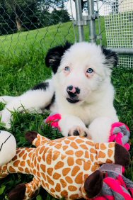 Bronwyn came to us on June 24, 2019 from the Grand Falls area where she had been stepped on by a large animal resulting in a broken tibia and fibula in her left hind leg. No one was available to care for her medical needs or undertake the recovery she would require.Bronwyn is a beautiful little Border Collie puppy. She is energetic, loving, happy and very pleased to have her foster mom to care for her. She loves all her foster brothers and sisters which include both cats and dogs. Bronwyn was not yet spayed, but is now. She is also fully vaccinated.Bronwyn's medical care included inserting pins in her leg to stabilize it. Her x-rays reveal that all is going very well and we expect that she'll be perfectly fine in no time. She was on kennel rest, then was slowly allowed to exercise her leg and it's going wonderfully. She's anxious to start the next portion of her journey in life which will be nothing but health, safety, love and family. On August 8, 2019, Bronwyn was adopted into a family in Fredericton. "Today is the first day of the rest of your life," Bronwyn! Congratulations! Send lots of photos!
