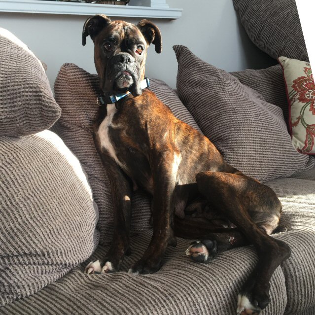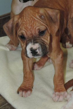 Boston came to DunRoamin' on November 14, 2014 when a shelter asked for help with 11 dogs who had been left with them. Boston and his seven siblings were born on September 5, 2014 and are Boxer puppies.All puppies were diagnosed with sarcoptic mange, otherwise known as scabies which is a mite that is very infectious and causes discomfort and itching. These dogs have all lost some hair and/or have a rash to some degree due to the scabies. All dogs received a medicinal bath and medication to cure the scabies and did very well with the medical expertise and care of the Florenceville Veterinary Clinic.On November 29, 2014, Boston was adopted to his new family and will live near Fredericton. Congratulations on your new life!