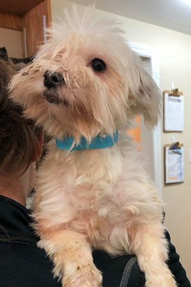 Venture returned to DunRoamin' on October 24, 2019. He originally came to DunRoamin' on June 21, 2019 from Woodstock through the NB SPCA. Venture was badly matted, had long nails, fleas, he was dirty and still intact. His living conditions were not acceptable for him so he was surrendered to DunRoamin' for care. Venture was shaved to remove the matts and his nails were trimmed, he was treated for parasites, given lots of good food and was neutered. He's now doing very well and is ready for a loving family.Venture was born about June 21, 2017. He is a Maltese mix and is a very nice boy. He's cautious about meeting new people, but he easily warms up once he gets to know them. He appears much more comfortable if he has another dog with him to keep him company. He loves to go for walks, loves to cuddle and loves attention. He would love to have a family where he can get all these things on demand! He's a lovely little boy. In July he was adopted, but he did not bond with part of the family and was not comfortable, so he came back to us to find a new home.On October 30, 2019, Venture met a nice lady from Jacksonville and they decided they'd like to move in together. Venture has a new canine sibling and lots of love and we're very happy for him. Please ask your mom to send us lots of photos and keep us up to date on your new life! Congratulations, Venture!