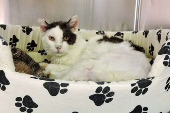 Elf came to us on December 21, 2016 when he was found curled up under an overpass near Greenfield. He was examined by our vet who determined that he was born about September 15, 2016. Elf was diagnosed with "synechia" which can be the result of untreated ulcers. His eyes have scars on the outside of each cornea - the outside edges have grey patches, meaning that although he has sight, he does not necessarily see well on his left and right periphery - he'd have to turn his head to see to the side. Elf is a beautiful little boy. He is cuddly, affectionate and playful. He's obviously grateful to be warm and safe and of course, everyone loves to have lots of food in their belly. He had earmites and received medication to treat them! His favourite toy is a mouse on an elastic which he will stretch out, let it go and then chase! He is adorable!On January 23, 2017, Elf became the best birthday present for a young lady who is a wonderful DunRoamin' supporter. He now lives with a young couple in Greenfield where he has a new dog and a new cat sibling - lots of friends to play with. And of course, a warm bed to sleep on with his two new favourite humans! Congratulations, Elf! Keep sending photos - we love to get them!