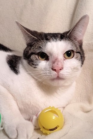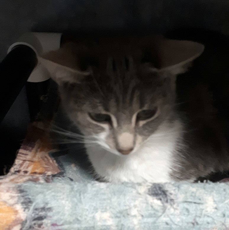 Panache came to us on March 29, 2020, from Northampton. She had been coming to a home for several days and they had been feeding her and had built her a shelter from the elements, but due to rental restrictions, she was not allowed to be inside. She was friendly, so had obviously been around people, but no one in the area recognized her. Her rescuers noticed that when she shook her head, blood came out of her ear. Panache was born about March 30, 2019, so was only about a year old. Panache was introduced to Dr Rennick on March 30, 2020 and he established that she had an infected polyp in her right ear which required surgery to remove - this was done on April 1, 2020. A biopsy was sent away to determine the exact cause of her problem. On April 8, we learned that Panache had a tumour in her ear which required surgery to remove her ear canal. That surgery was performed by Dr Monteith on April 15, 2020. Donations to help with the cost of her surgery are gratefully accepted through Canada Helps or various other methods - check out our Donate page!Panache has had the benefit of surgery and is doing much better. She may require a further surgery down the road and we thank all who donated to help her. We are all gratefulOn May 15, 2020, Panache was adopted by a young couple in Northampton where she will be spoiled beyond her wildest dreams. No more pain, no more trying to survive out there on her own. She now has family to care for her and she will do the same for them. Congratulations, Panache - we are so happy for you!!