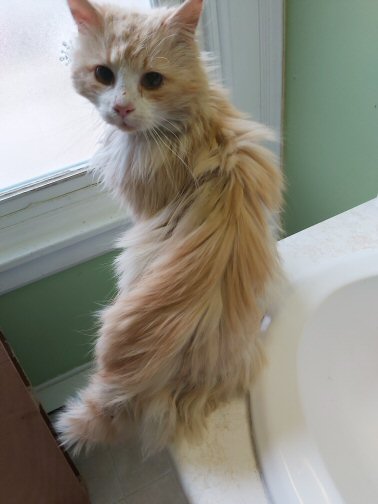 Baffle came to us on June 21, 2019 from Woodstock through the NB SPCA. Baffle was born about June 21, 2005 and is a beautiful orange tabby female.Baffle was severely matted, had fleas, was very skinny, dehydrated and had an ulcerated mouth which made it painful for her to eat - perhaps that's why she was so thin.Baffle has a beautiful personality. She loves everyone, and now that she has had all her mats removed, is receiving medication as necessary and all the food and water she can ingest, she's so much better. She had to have a feeding tube inserted as she was not able to receive food and medication through her mouth due to her ulcers. They've since improved greatly, though, and we're sure she'll be well soon. We hope we can find this little senior cat a nice, loving home where she can live out the rest of her years in love and comfort.On January 30, 2020, Baffle won the jackpot. She had been fostered by a very caring vet tech for several weeks and worked her marvelous charm on her - she couldn't possibly do without her in her life! She has officially been welcomed as a permanent (and very spoiled) old lady who has several new permanent siblings, including DunRoamin's Tawny who is also spoiled beyond her wildest dreams! Congratulations, Baffle! Thanks to your mom - for everything!!