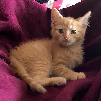 Waverleigh came to us on June 30, 2020 from Perth-Andover where she had been found in the grass with her mother, Whimsy (see above) and sister Wynter. Waverleigh was born about June 23, 2020, so was only about one week old. All cats were covered with fleas which can be very dangerous for any cat, but especially so for such tiny babies, as the fleas can drain large amounts of blood that babies need to survive. Fortunately, these little ones - and their mom - will now never have to suffer from these parasites again.Waverleigh was healthy and is an extremely cute little buff-orange kitten who is active, loving and playful. She loves every human and cat she has met, and she's looking forward to having a home and family to whom she can show her gratitude for this new life she has received!On September 29, 2020, Waverleigh and her mom went to visit their friends at The Purrfect Cup Cat Cafe where they hoped to meet their new family. Please drop in - you'll love the coffee, humans and cats!! Waverleigh very quickly became a huge hit and was requested to join multiple families!On October 10, 2020, Waverleigh was adopted by a family in Douglas where she fell in love with their 10-year old son and vice versa. She will have two other feline family members. Congratulations, Waverleigh! What a wonderful Thanksgiving present! Don't forget to write!! | |