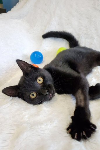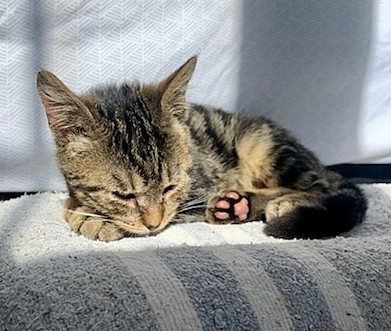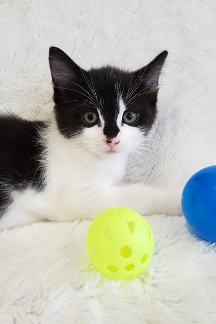 Doppler is a little boy who came to us on April 5, 2019 from Summerfield. He and his three siblings (Audio, Video and Zadann) were born about April 1, 2019, so were only about a week old. They were very grateful for the medical care and concern they received on this day from the Florenceville Veterinary Clinic. We thank Dr Monteith and her staff once again for making their new lives possible, as well as all the people who will donate, provide food, love, fostering and all other things they will require before leaving us to begin their lives in safe, warm, loving homes.Doppler is a very cute little boy who loves to sleep upside down! He is big for his age and loves people! He was on medication for his mouth due to some stomatitis, but he is now doing very well. He should be checked every six months for awhile to make sure stomatitis is not an issue, but he appears to be fine. He is very anxious for a home where he can be cuddled forever!On February 22, 2020, Doppler was very excited when his new family arrived to take him home. He now lives in Woodstock where he is a best friend for a dog and two young children who will give him his best wish - to be loved forever! Congratulations, Doppler! Send us lots of photos!!