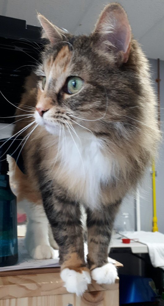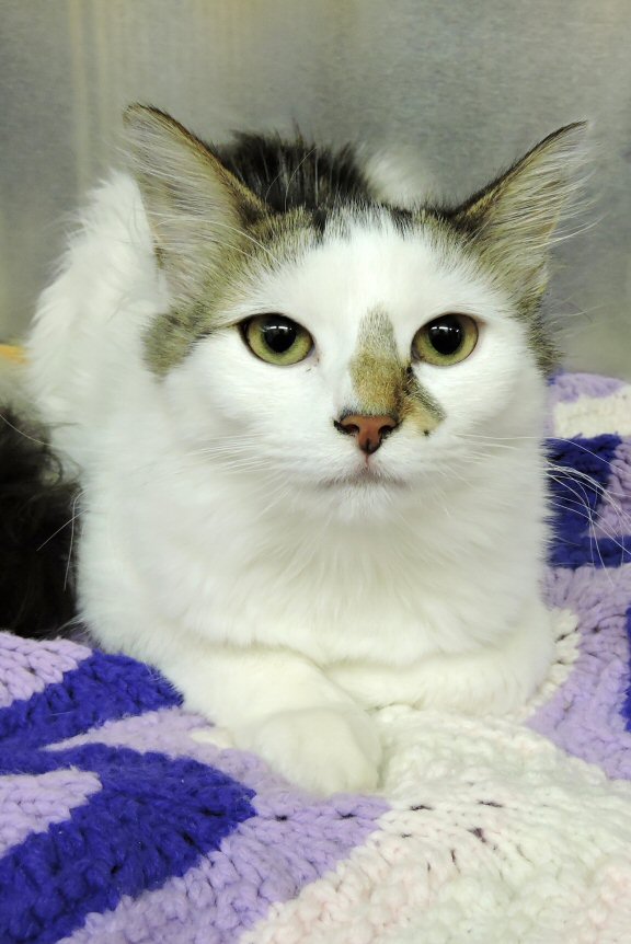 Brenda came to us on October 8, 2019 from Belleville where she, another cat and a kitten were left in a box outside someone's home. The other two felines were healthy were cared for by the people who brought Brenda to us. She was pregnant, had flea allergy dermatitis, burdocks in her fur, had a hot/itchy ear and a broken tooth which required dental surgery. Brenda was born about October 8, 2012.Brenda is full of purrsonality! She will purr and cuddle, then maybe swat your hand - just because! She is beautiful and will make a wonderful addition to any family who appreciates character! She is spayed, fully vaccinated, tested for FIV and FeLV and treated for all parasites. She is anxious for a new home and family of her very own. On February 8, 2020, she went to stay with her friends at The Purrfect Cup, Two Nations Crossing, Fredericton, then returned to us in February when she had a bit of upper respiratory infection which has since been resolved and she is overseeing us as we work in our Reception Area, which she now rules!On March 30, 2020, Brenda was excited to move to the Oromocto SPCA where she will find a home very quickly as they have plenty of people looking for a beauty just like her. Congratulations, Brenda. Thank Tracey for us again!