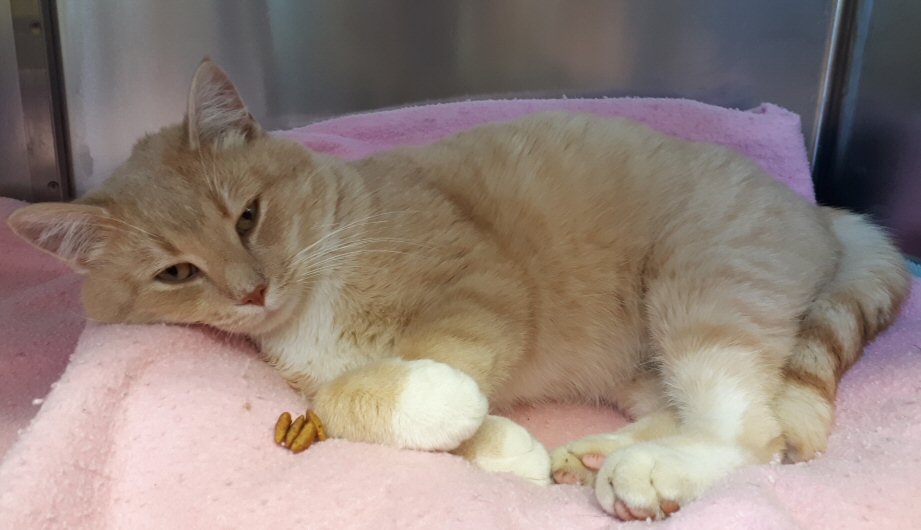 Hannigan came to us from Wakefield on January 28, 2020 when he was observed to be limping after being involved in a fight. He was examined by his new vet at Florenceville Veterinary Clinic and found to be dehydrated and had scabs all over his body from fight wounds. He was prescribed antibiotics to fight infection, was neutered and started his vaccine protocol. He was born about January 27, 2018.Hannigan is a very nice boy who is very friendly and loving. His fight wounds are most probably as a result of trying to survive and obtain food. He is very loving and has shown no aggression to other cats. He will be ready to go to a home about the end of February and he's really looking forward to having his own home and his very own humans!On February 1, 2020, Hannigan was very excited to learn that he had been adopted by a very nice lady who had fallen in love with him at first sight. And vice versa! Congratulations, Hannigan! Stay in touch!!